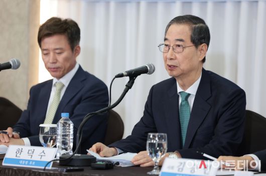 아시아투데이 송의주 기자 = 한덕수 무소속 대통령선거 예비후보가 6일 서울 중구 코리아나호텔에서 열린 관훈클럽 초청 토론회에서 기조연설을 하고 있다.