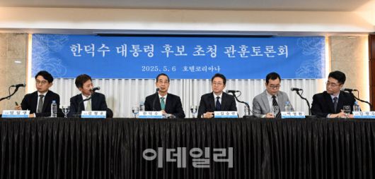 [국회사진취재단] 한덕수 무소속 대통령선거 예비후보가 6일 서울 중구 코리아나호텔에서 열린 관훈클럽 초청 토론회에서 기조연설을 하고 있다.