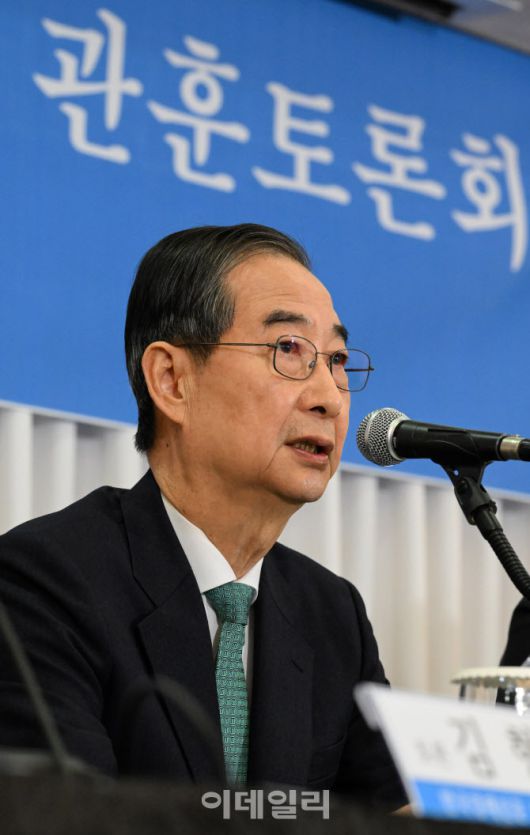[국회사진취재단] 한덕수 무소속 대통령선거 예비후보가 6일 서울 중구 코리아나호텔에서 열린 관훈클럽 초청 토론회에서 기조연설을 하고 있다.