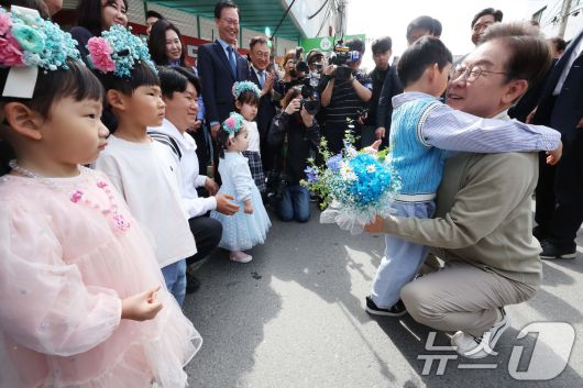 (증평=뉴스1) 안은나 기자 = 이재명 더불어민주당 대통령 후보가 골목골목 경청투어 이틀차를 맞은 6일 오전 충북 증평군 장뜰시장에 도착, 어린이에게 꽃다발을 선물받고 있다. (공동취재) 2025.5.6/뉴스1coinlocker@news1.krCopyright ⓒ 뉴스1. All rights reserved. 무단 전재 및 재배포, AI학습 이용 금지.