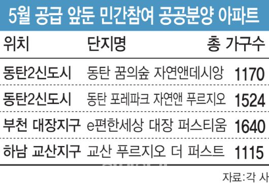 [이데일리 남궁민관 기자] 올 들어 수도권 분양 가뭄이 이어지는 가운데 5월 민간참여 공공분양 소식이 전해지면서 수요자들의 이목을 끌 전망이다. 민간참여 공공분양은 청약 가점제가 적용되지 않아 가점이 낮은 청약자도 당첨 가능성이 높은 데다, 분양 예정 중인 단지 면면 동탄·부천·하남 등 주요 입지에 자리한 1000가구 이상 대단지여서다.