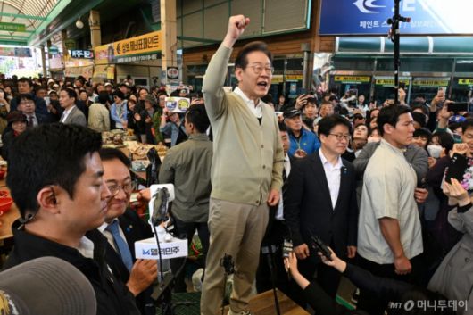 [증평=뉴시스] 조성봉 기자 = 민심을 청취하는 '경청 투어'에 나선 이재명 더불어민주당 대선후보가 6일 충북 증평군 장뜰시장에서 즉흥 연설을 하고 있다.(공동취재) 2025.05.06. photo@newsis.com /사진= |