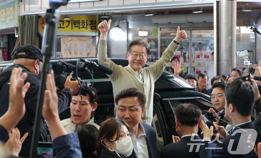 (증평=뉴스1) 안은나 기자 = 이재명 더불어민주당 대통령 후보가 골목골목 경청투어 이틀차를 맞은 6일 오전 충북 증평군 장뜰시장을 찾아 상인들을 향해 인사를 하고 있다. (공동취재) 2025.5.6/뉴스1