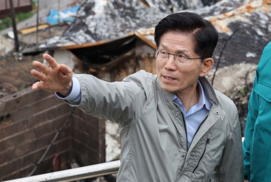 국민의힘 김문수 대선 후보가 6일 대형 산불 피해를 입은 경북 영덕군 영덕읍 석리 따개비마을을 방문해 복구 현황 살펴보고 있다. 〈사진=연합뉴스〉 |