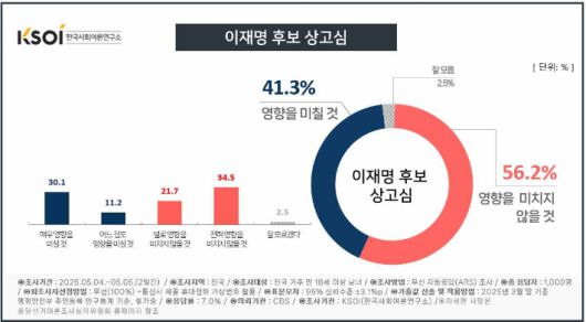 장 부소장은 "'영향이 없을 것'이라는 응답은 진보층에서 84.3%, 중도층에서 56.9%로 나타났으며, 보수층에서도 37%로 나타났다"며 "결국 기존 지지 성향이 그대로 유지되거나 강화되며 큰 변수가 되지 못할 것으로 보인다"고 분석했다.