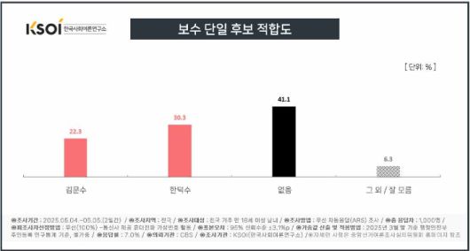 KSOI 장형철 부소장은 "4자 구도에서 한덕수∙김문수∙이준석 후보 모두의 지지를 합쳐도 이재명 후보가 6.1%포인트 앞서는 것으로 나타났으며, 3자 구도에서도 이준석 후보의 지지까지 합산했을 경우, 김문수∙이준석 후보는 7.4%포인트, 한덕수∙이준석 후보는 6.4%포인트 뒤쳐지는 것으로 나타나 빅텐트 효과가 여전히 제한적인 것으로 보인다"고 분석했다.