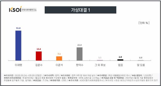 CBS노컷뉴스가 한국사회여론연구소(KSOI)에 의뢰해 전국 만 18세 이상 남녀 1천 명을 대상으로 지난 4일부터 5일까지 이틀간 진행, 6일 발표한 여론조사 결과 이재명 후보는 국민의힘 김문수 대선 후보와 개혁신당 이준석 대선 후보, 무소속 한덕수 대선 예비후보가 출마하는 가상 대결에서 모두 50%를 넘는 지지율을 기록했다.