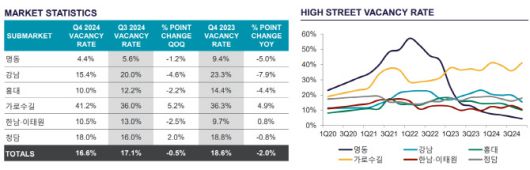 6대 상권 공실률은 △명동(4.4%) △홍대(10.0%) △한남·이태원(10.5%) △강남(15.4%) △청담(18.0%) △가로수길(41.2%) 순이다.