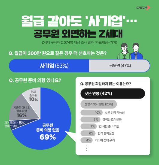 상위권 채용 플랫폼 캐치가 6일 Z세대 구직자 2074명을 대상으로 월급이 300만 원으로 같은 경우 사기업과 공무원 중 어디를 선택할지 질문한 결과 ‘사기업’을 선택한 비중이 53%로 ‘공무원(47%)’보다 높았다.