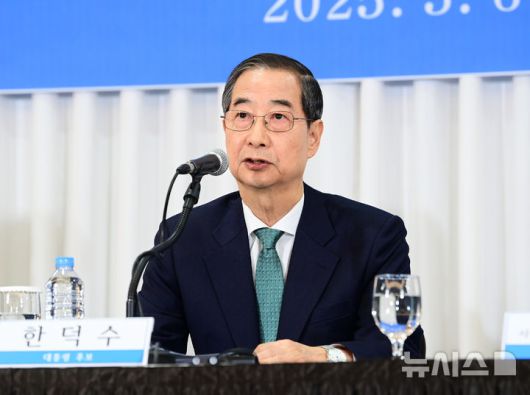 [서울=뉴시스]하지현 우지은 기자 = 한덕수 무소속 대선 예비후보는 6일 김문수 국민의힘 대선 후보와의 단일화 논의를 두고 "단일화가 실패하는 것은 국민에 대한 큰 배신이고 배반이 될 것"이라며 "어떤 방식의 단일화에도 다 찬성한다"고 밝혔다.