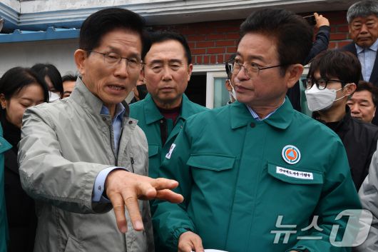 김문수 국민의힘 대통령 후보가 6일 초대형산불피해지역인 경북 영덕군 영덕읍 석리 마을에서 이철우 경북지사의 안내로 피해 상황을 보고 받고 있다. ⓒ News1 최창호 기자 |