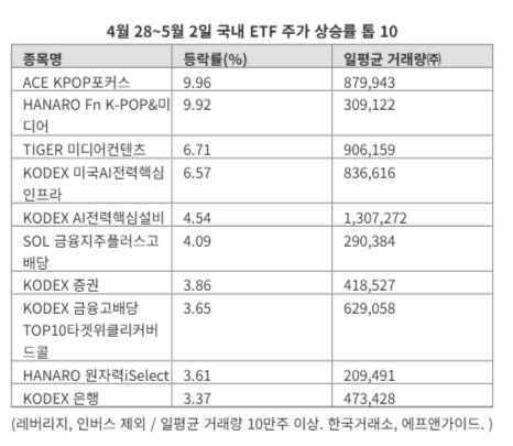 6일 한국거래소와 금융정보업체 에프앤가이드에 따르면 지난달 28일부터 이달 2일까지 ETF 시장에서 높은 수익률을 기록한 종목은 ‘ACE KPOP포커스’와 ‘HANARO Fn K-POP&미디어’이다. 각각 9.96%, 9.92% 상승했다. 이어 ‘TIGER 미디어컨텐츠’가 6.71% 올랐다. 레버리지 및 인버스와 일평균 거래량이 10만주 미만인 종목은 이번 조사에서 제외됐다.