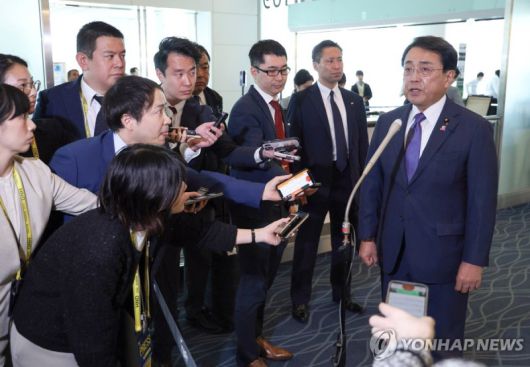 아카자와 료세이 일본 경제재생상이 지난달 30일 방미 출국에 앞서 취재진에게 브리핑을 하고 있다. 연합뉴스