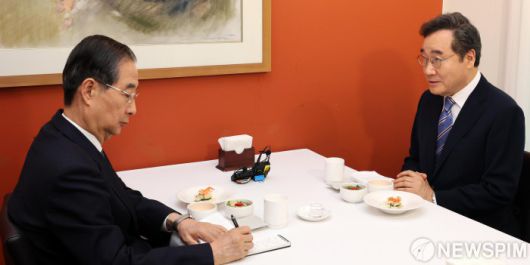 [서울=뉴스핌] 윤창빈 기자 = 한덕수 대선 예비후보, 이낙연 전 국무총리가 6일 오후 서울 중구 달개비에서 오찬 회동을 갖고 있다. 2025.05.06 pangbin@newspim.com