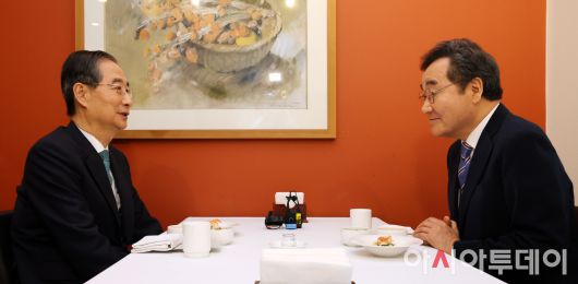 아시아투데이 송의주 기자 = 한덕수 무소속 대통령선거 예비후보(왼쪽)와 이낙연 전 국무총리가 6일 서울 중구의 한 음식점에서 오찬 회동을 하고 있다. ⓒ "젊은 파워, 모바일 넘버원 아시아투데이"