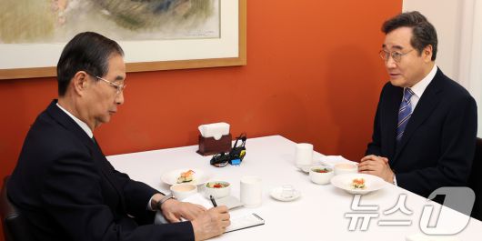 (서울=뉴스1) 허경 기자 = 한덕수 무소속 대통령선거 예비후보와 이낙연 전 국무총리가 6일 서울 중구 컨퍼런스하우스 달개비에서 오찬회동을 하고 있다. (공동취재) 2025.5.6/뉴스1