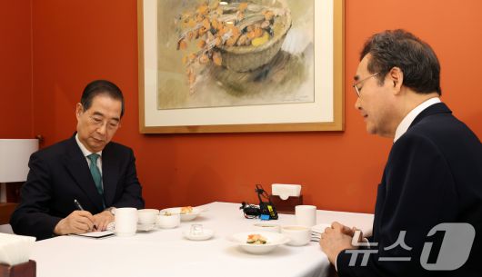 (서울=뉴스1) 허경 기자 = 한덕수 무소속 대통령선거 예비후보와 이낙연 전 국무총리가 6일 서울 중구 컨퍼런스하우스 달개비에서 오찬회동을 하고 있다. (공동취재) 2025.5.6/뉴스1