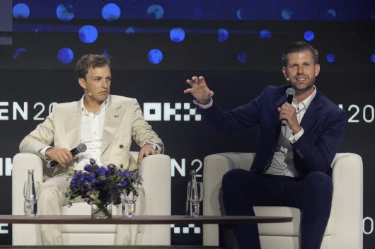 에릭 트럼프(오른쪽) 트럼프 오거니제이션 부사장이 지난 1일 아랍에미리트 두바이에서 열린 암호화폐 행사 ‘토큰 2049’에서 발언하고 있다. 두바이/AP 연합뉴스 |