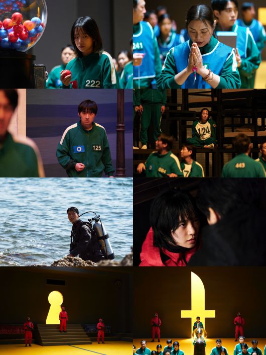 티저 포스터, 예고편과 함께 공개된 보도스틸에는 반란 이후 새로운 국면을 맞게 된 인물들의 모습이 담겨있다. 핑크가드들에게 붙잡혀 울부짖고 있는 '기훈'의 스틸은 그의 처절한 심정을 고스란히 전달한다. '기훈'의 스틸과 달리 여유가 느껴지는 '프론트맨'(이병헌)의 스틸은 참가자 1번 '영일'에서 게임의 총괄자로 돌아온 '프론트맨'이 '기훈'과 어떤 대결을 이어가게 될지 궁금하게 만든다. 살아남은 참가자 '명기'(임시완), '대호'(강하늘), '현주'(박성훈), '용식'(양동근), '금자'(강애심), '준희', '선녀'(채국희), '민수'(이다윗), '남규'(노재원)의 모습도 인상적이다. 게임이 진행될수록 더 강력한 두려움과 긴장감을 맞닥뜨리며 피폐해져가는 이들이 과연 끝까지 살아남을 수 있을지 관심이 집중된다. 산소통을 메고 해안가에서 숨을 고르고 있는 '준호'의 스틸은 그가 과연 게임이 펼쳐지는 섬을 발견하고 돌아올 수 있을지 궁금하게 한다. 가면을 벗은 채 누군가와 대립하고 있는 '노을'의 스틸은 핑크가드의 규율을 깬 그가 어떤 행보를 보여줄지 이목을 집중시킨다. 이어, 열쇠 구멍과 칼 모양의 문이 있는 방에 모여있는 참가자들의 모습은 시즌3에서 새롭게 등장할 게임을 예고하며 전 세계 시청자들의 마음을 설레게 한다.