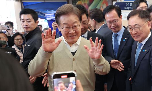 이재명 더불어민주당 대통령 후보가 골목골목 경청투어 이틀차를 맞은 6일 오전 충북 증평군 장뜰시장을 찾아 상인과 인사하고 있다. 증평=뉴스1 |