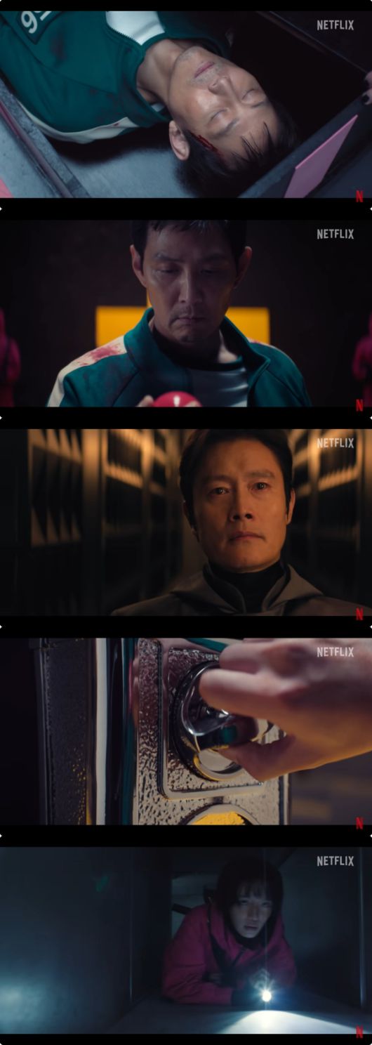 영상은 핑크 가드들이 관을 들고 참가자들이 있는 생활동으로 들어오는 모습으로 시작된다. 관에는 성기훈(이정재)이 얼굴에 피를 흘린 채 누워있다. 관 뚜껑이 열리자 성기훈이 눈을 뜬다.