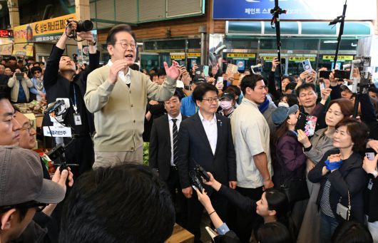 [헤럴드경제=김진 기자] 이재명 더불어민주당 대선 후보는 6일 “이번 대선이 국힘 후보와 경쟁인 줄 알았는데, 국힘 후보는 어디 가고 난데없이 대한민국 거대 기득권과 싸우고 있다”고 말했다.