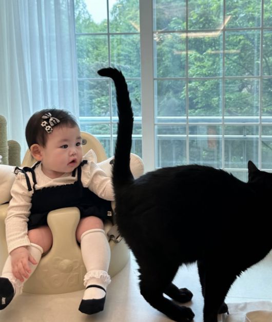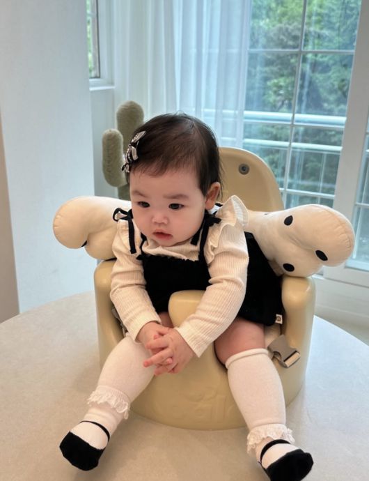 공개된 사진 속에는 아기 의자에 앉아 있는 박수홍의 딸, 재이의 모습이 담겼다. 레이스 양말과 블라우스를 매치한 재이의 깜찍한 미모와 패션이 시선을 끈다.