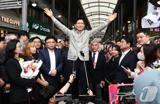 (포항=뉴스1) 김민지 기자 = 김문수 국민의힘 대통령 후보가 6일 경북 포항시 죽도시장을 찾아 시민들을 향해 인사하고 있다. 2025.5.6/뉴스1