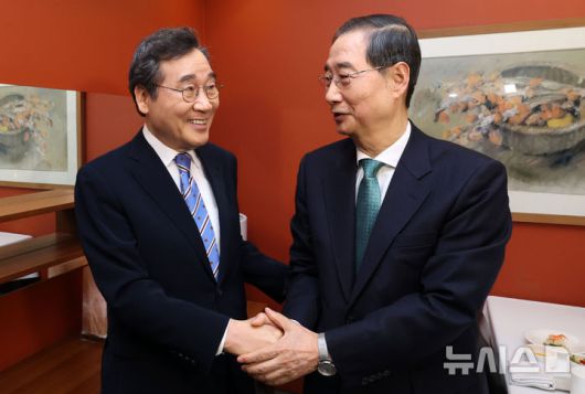 [서울=뉴시스] 정병혁 기자 = 한덕수 무소속 대통령 선거 예비 후보와 이낙연 새미래민주당 상임고문이 6일 서울 중구 달개비 컨퍼런스하우스에서 오찬회동에 앞서 인사를 나누고 있다 (공동취재) 2025.05.06. photo@newsis.com |