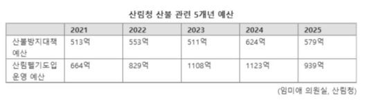 6일 본지가 임미애 더불어민주당 의원실을 통해 산림청으로부터 받은 자료에 따르면 최근 5년간 산불방지대책 예산은 2021년 513억원, 2022년 553억원, 2023년 511억원 등 해마다 600억원을 넘지 못했다.