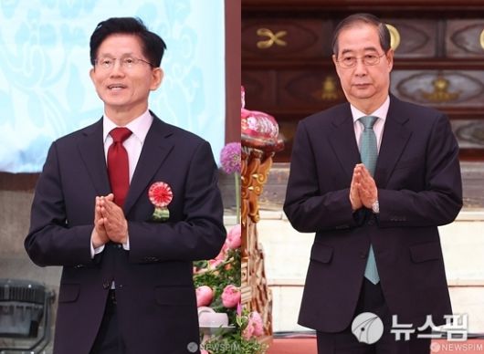 김문수 국민의힘 6·3 대통령 선거 후보(왼쪽), 한덕수 무소속 대선 예비후보가 5일 오전 서울 종로구 조계사에서 열린 불기 2569년 부처님오신날 봉축법요식에서 헌화한 뒤 합장하고 있다. [사진=뉴스핌 DB] |