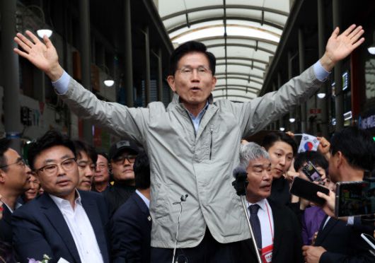 김문수 국민의힘 대선 후보가 6일 경북 포항시 죽도시장을 찾아 시민들에게 인사하고 있다. 연합뉴스 |