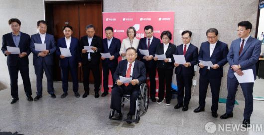 [서울=뉴스핌] 윤창빈 기자 = 이상민 국민의힘 대전시당위원장을 비롯한 원외 당협위원장들이 6일 오후 서울 여의도 국회에서 김문수 대선 후보와 한덕수 예비후보의 단일화를 촉구하는 호소문을 발표하고 있다. 2025.05.06 pangbin@newspim.com