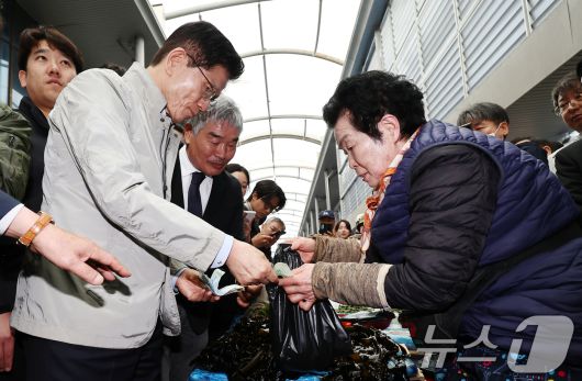 (포항=뉴스1) 김민지 기자 = 김문수 국민의힘 대통령 후보가 6일 경북 포항시 죽도시장에서 미역을 구입하고 있다. 2025.5.6/뉴스1kimkim@news1.krCopyright ⓒ 뉴스1. All rights reserved. 무단 전재 및 재배포, AI학습 이용 금지.
