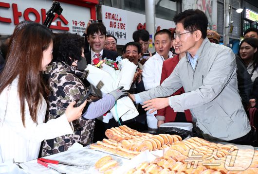 (포항=뉴스1) 김민지 기자 = 김문수 국민의힘 대통령 후보가 6일 경북 포항시 죽도시장에서 꽈배기를 구입하던 도중 상인에게 꽃다발을 건네고 있다. 2025.5.6/뉴스1kimkim@news1.krCopyright ⓒ 뉴스1. All rights reserved. 무단 전재 및 재배포, AI학습 이용 금지.