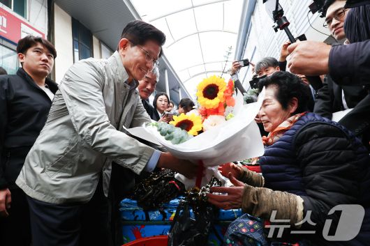 (포항=뉴스1) 김민지 기자 = 김문수 국민의힘 대통령 후보가 6일 경북 포항시 죽도시장에서 상인에게 꽃다발을 건네고 있다. 2025.5.6/뉴스1kimkim@news1.krCopyright ⓒ 뉴스1. All rights reserved. 무단 전재 및 재배포, AI학습 이용 금지.