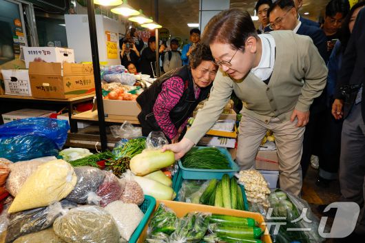 (옥천=뉴스1) 안은나 기자 = 이재명 더불어민주당 대통령 후보가 골목골목 경청투어 이틀차인 6일 오후 충북 옥천군 공설시장을 찾아 무를 구입하고 있다. 2025.5.6/뉴스1coinlocker@news1.krCopyright ⓒ 뉴스1. All rights reserved. 무단 전재 및 재배포, AI학습 이용 금지.