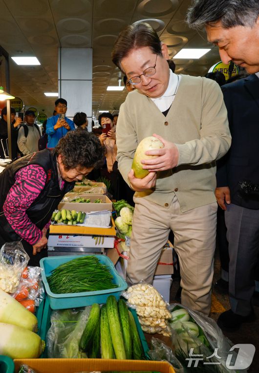 (옥천=뉴스1) 안은나 기자 = 이재명 더불어민주당 대통령 후보가 골목골목 경청투어 이틀차인 6일 오후 충북 옥천군 공설시장을 찾아 무를 구입하고 있다. 2025.5.6/뉴스1