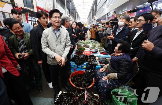 (포항=뉴스1) 김민지 기자 = 김문수 국민의힘 대통령 후보가 6일 경북 포항시 죽도시장을 찾아 둘러보고 있다. 2025.5.6/뉴스1kimkim@news1.krCopyright ⓒ 뉴스1. All rights reserved. 무단 전재 및 재배포, AI학습 이용 금지.