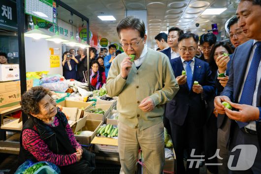 (옥천=뉴스1) 안은나 기자 = 이재명 더불어민주당 대통령 후보가 골목골목 경청투어 이틀차인 6일 오후 충북 옥천군 공설시장을 찾아 오이를 사먹고 있다. 2025.5.6/뉴스1