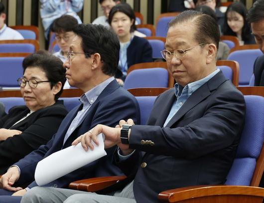 권영세 국민의힘 비상대책위원장(맨 오른쪽)이 6일 오후 서울 여의도 국회에서 열린 의원총회에 참석해 시계를 보고 있다. 신소영 기자 viator@hani.co.kr |