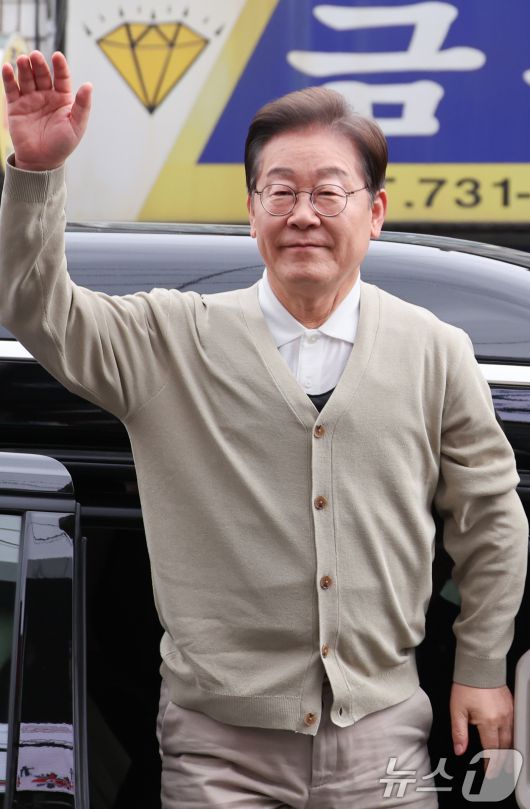 (옥천=뉴스1) 안은나 기자 = 이재명 더불어민주당 대통령 후보가 골목골목 경청투어 이틀차인 6일 오후 충북 옥천군 공설시장에 도착해 인사하고 있다. 2025.5.6/뉴스1coinlocker@news1.krCopyright ⓒ 뉴스1. All rights reserved. 무단 전재 및 재배포, AI학습 이용 금지.