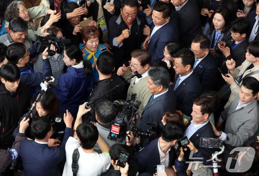 (옥천=뉴스1) 안은나 기자 = 이재명 더불어민주당 대통령 후보가 골목골목 경청투어 이틀차인 6일 오후 충북 옥천군 공설시장을 찾아 인사하고 있다. (공동취재) 2025.5.6/뉴스1photo@news1.krCopyright ⓒ 뉴스1. All rights reserved. 무단 전재 및 재배포, AI학습 이용 금지.