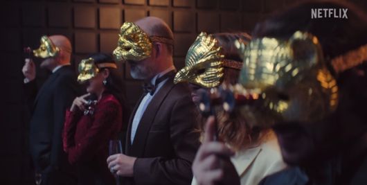 육각형 모양 테이블에 앉아 음식을 기다리고 있는 장면을 보면 금장 가면을 쓴 3명의 남성과 2명의 여성을 확인할 수 있다. 또한 일렬로 도열한 채 어딘가를 응시하는 장면에선 VIP들이 참가자들의 게임 영상을 실시간으로 지켜보는 듯한 느낌을 준다.