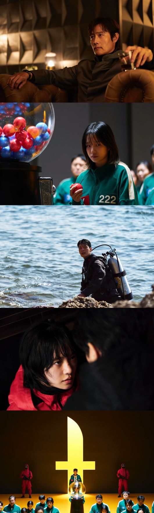 그의 주변에는 핑크 리본으로 장식된 관들이 놓여 있었다. 오징어 게임 참가자들의 운명을 암시했다. 465억 원 상금을 위해 목숨을 내놓아야 하는 것.