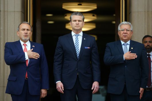 피트 헤그세스 미 국방장관(가운데)가 페루 외교장관(왼쪽)과 국방장관(오른쪽)을 국방부에서 만나고 있다. EPA 연합뉴스 |