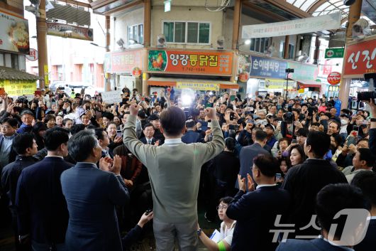 (영동=뉴스1) 안은나 기자 = 이재명 더불어민주당 대통령 후보가 골목골목 경청투어 이틀차인 6일 오후 충북 영동군 영동중앙시장을 찾아 즉흥 연설하고 있다. 2025.5.6/뉴스1