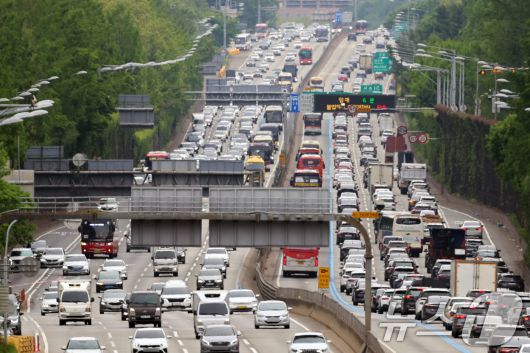 어린이날 연휴 마지막 날인 6일 서울 잠원IC 인근 경부고속도로 상(왼쪽)·하행선 방향 차량들이 서행하고 있다. 2025.5.6/뉴스1 ⓒ News1 황기선 기자