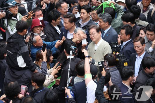 (영동=뉴스1) 안은나 기자 = 이재명 더불어민주당 대통령 후보가 골목골목 경청투어 이틀차인 6일 오후 충북 영동군 영동중앙시장을 찾아 인사하고 있다. 2025.5.6/뉴스1
