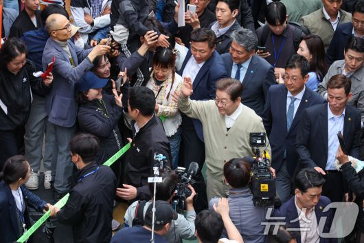 (영동=뉴스1) 안은나 기자 = 이재명 더불어민주당 대통령 후보가 골목골목 경청투어 이틀차인 6일 오후 충북 영동군 영동중앙시장을 찾아 인사하고 있다. 2025.5.6/뉴스1